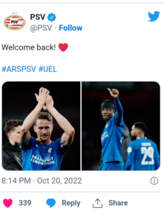 London born winger of Nigerian descent Nonso Madueke made his comeback from injury as PSV Eindhoven were defeated 1-0 by Arsenal in a UEFA Europa League clash at the Emirates Stadium on Thursday evening.