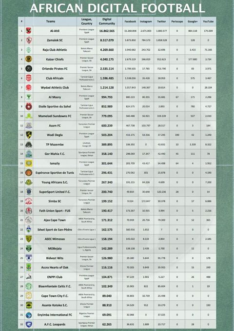Egyptian giants Al Ahly top the digital benchmark for Africa with more 16 million followers in their digital community that includes Facebook, Instagram, Twitter, Google+ and YouTube.