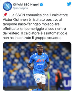 “The SSCN reports that footballer Victor Osimhen tested positive for the molecular naso-pharyngeum swab on his return from abroad yesterday afternoon. The player is asymptomatic and has not met the team group,” a statement from the club read.