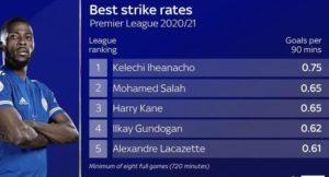 Iheanacho, whose partnership with Jamie vardy came to the force in the absence of James maddison and Harvey Barnes,also scored league goals in the 2-1 win at Brighton and the 1-1 draw against Burnley