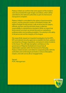The Jos-based side has urged the NPFL, the Nigeria Football Federation (NFF), and security agencies to conduct an impartial investigation to determine the facts, address any violations, and prevent a recurrence.