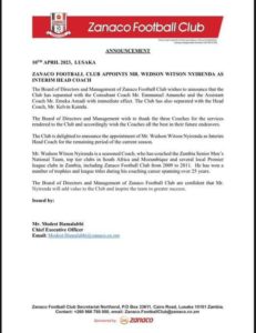 In a statement released by the club management, Wedson Witson Nyirenda will replace him on an interim basis till the end of the season.